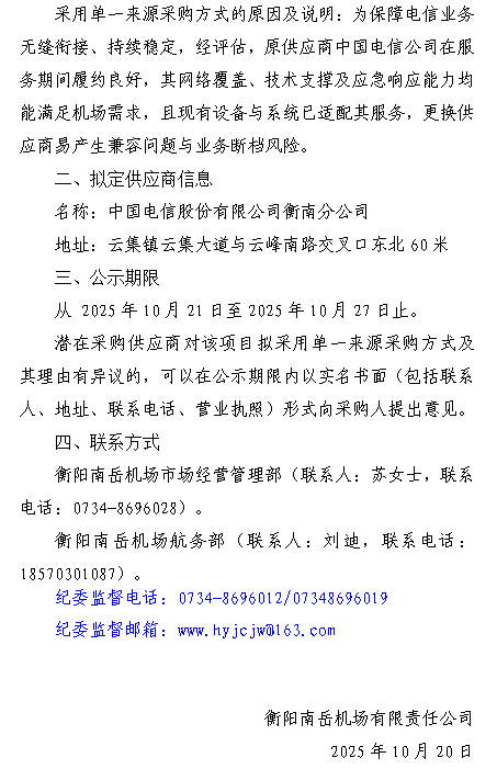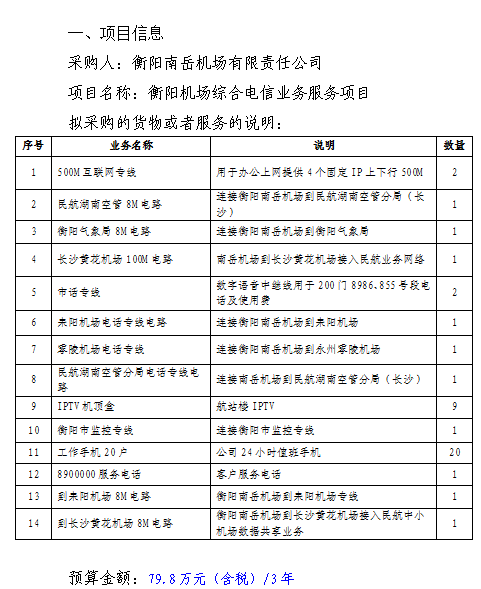 衡阳机场综合电信业务服务项目单一来源采购公告